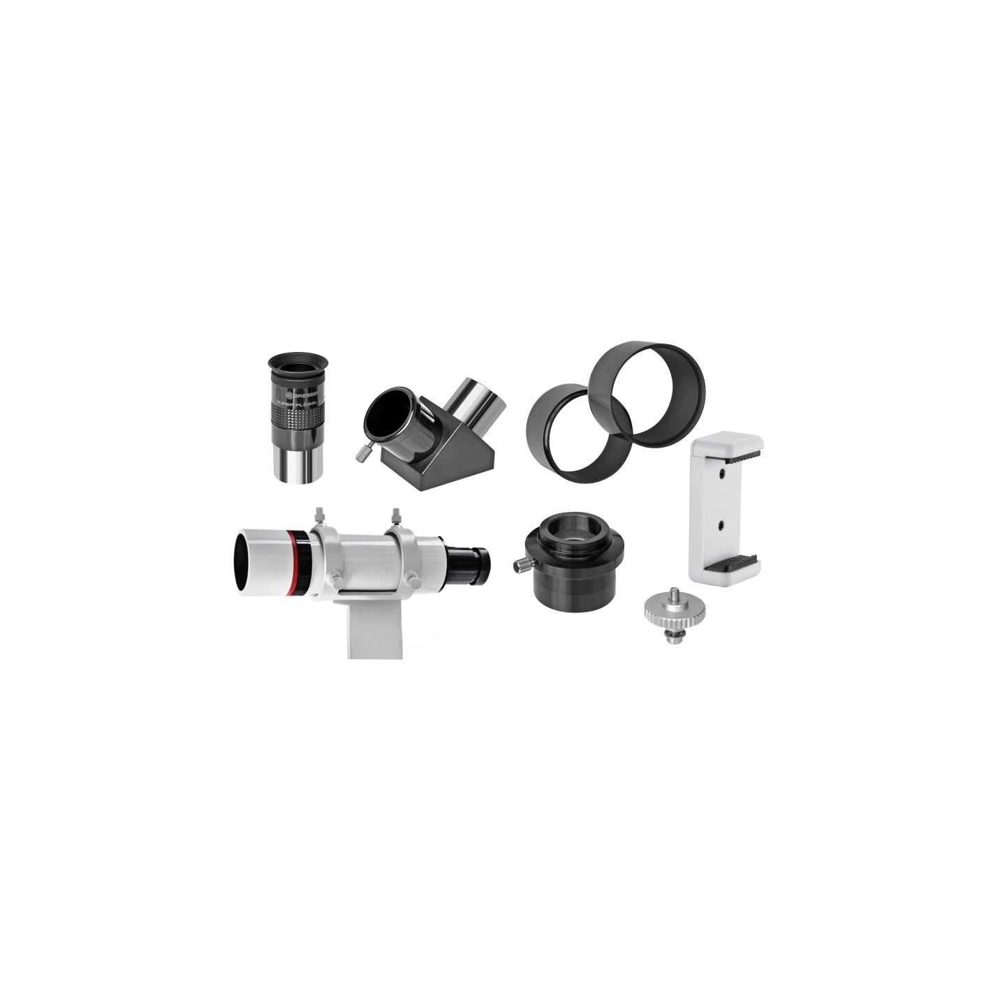OTelescópioé constituído por um telescópio refratário (Refrator) e uma montagem equatorial com tripé incluída. A ótica tem uma abertura livre de 127 mm com uma distância focal de 635 mm e uma relação focal de F5. O refrator tem muitos extras, como braçadeiras de tubo com pega e suporte de câmara integrado, espelho zenital de 31,7 mm (1,25") ou localizador 8x50. Com a montagem equatorial EXOS-2 (também conhecida como paralaxe), um eixo está alinhado com a Estrela Polar. Ao seguir um objeto celeste, apenas um eixo precisa de ser movido, o que torna o seguimento muito mais fácil em comparação com as montagens que apenas têm os eixos esquerdo/direito e para cima/baixo (montagem azimutal). Com o localizador 8x50 incluído no conjunto, os objectos celestes são facilmente encontrados. O visor possui também um retículo para uma observação mais cómoda no escuro. A montagem possui também um localizador polar iluminado que simplifica bastante o alinhamento com o norte. Por meio de dois eixos flexíveis ligados à unidade de movimento fino, os objectos podem ser ajustados e seguidos com precisão na ocular. O tripé estável em tubo de aço inoxidável é regulável em altura, garantindo assim uma posição de observação confortável.