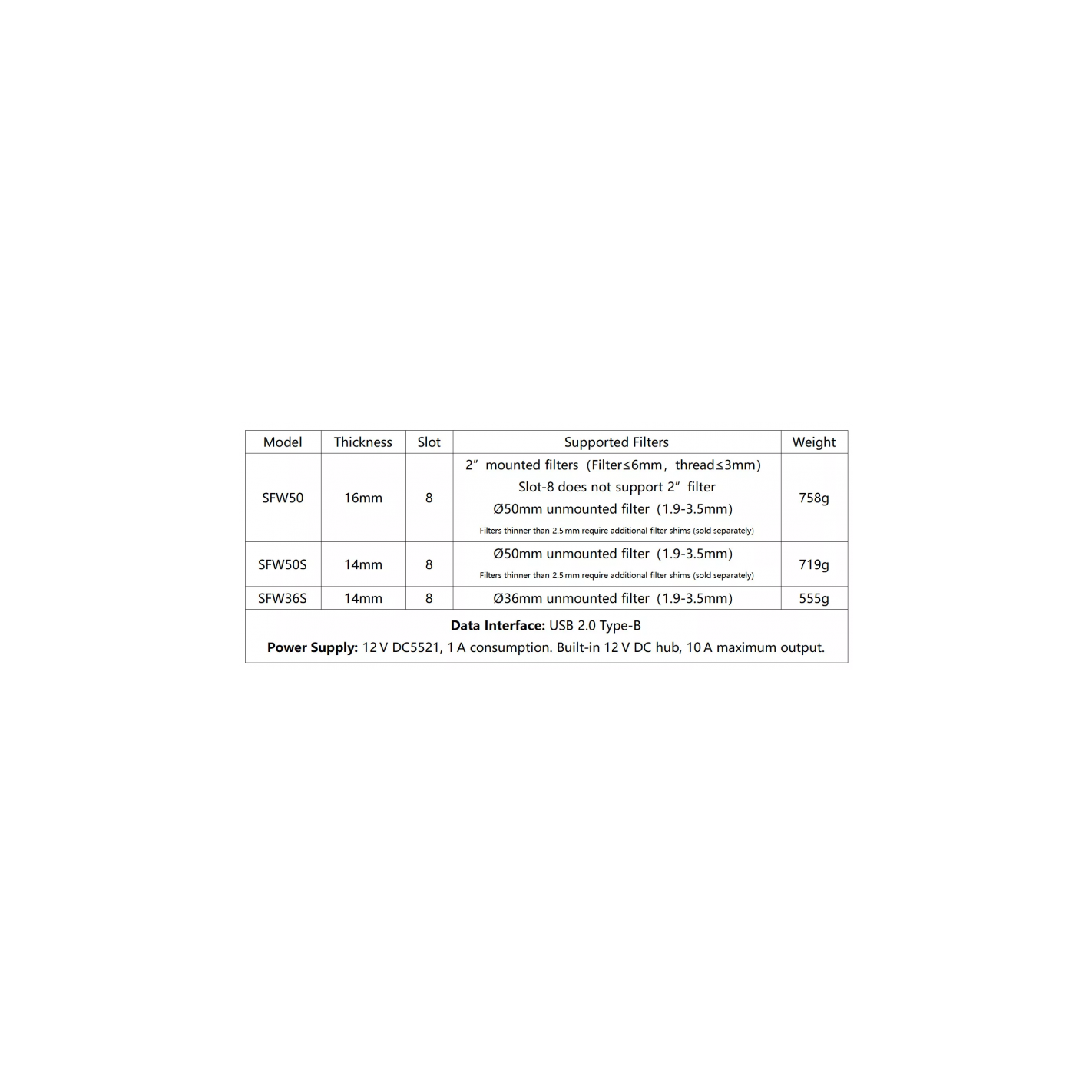 A Snowflake SFW36S é uma roda de filtro de 8 posições de qualidade superior, concebida para os profissionais de astrofotografia que exigem a máxima precisão, rigidez mecânica e um design compacto. Compatível com filtros não montados de 36 mm (1,9 a 3,5 mm de espessura), este modelo é ideal para configurações de imagem com limitações de retrofocagem.