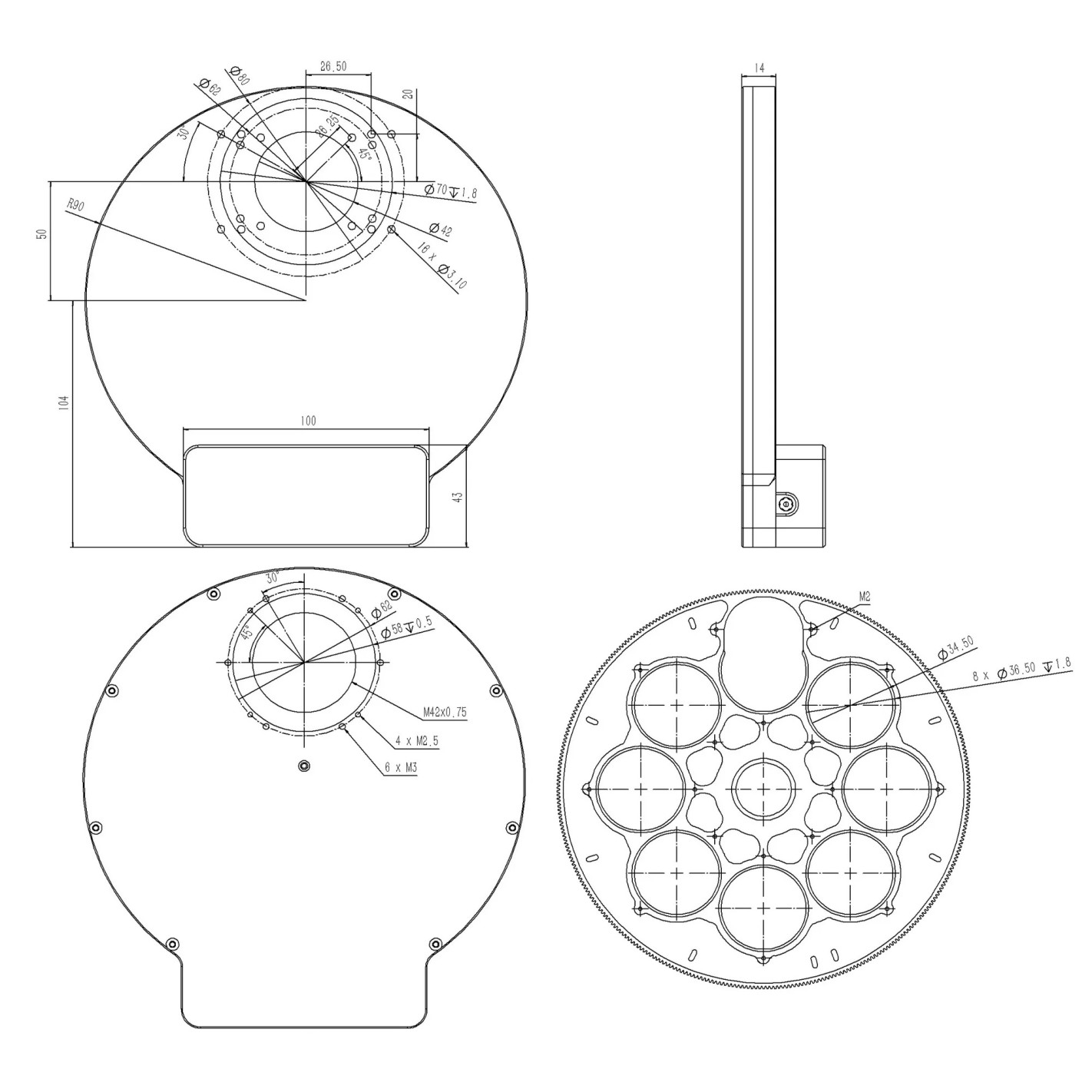 Roda de filtro Snowflake SFW36S: 8 posições para filtros não montados Ø36 mm e apenas 14 mm de espessura, de baixo perfil.