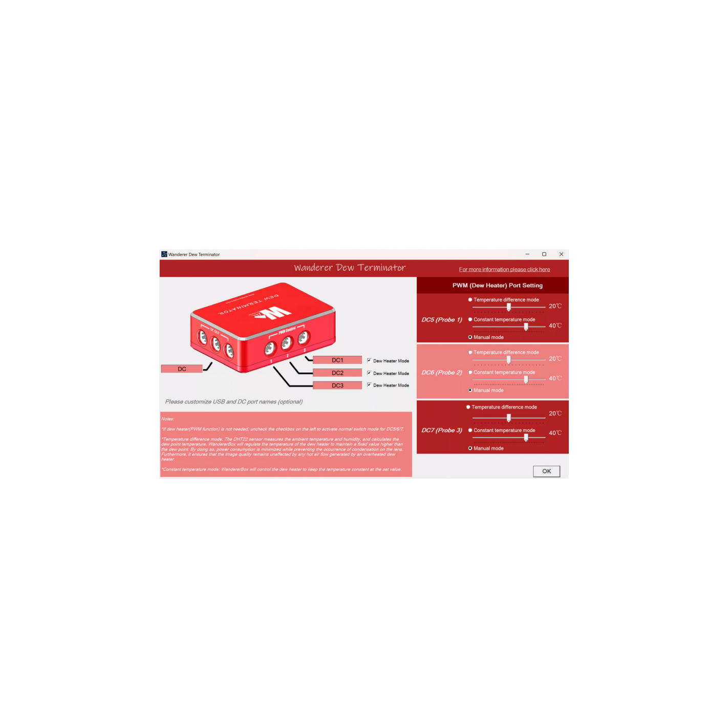 O Wanderer Dew Terminator é um controlador inteligente compacto e altamente avançado para aquecedores de orvalho, concebido para astrofotógrafos que exigem uma gestão precisa e automatizada da humidade e da temperatura. Com controlo independente para três canais de pulverização, monitorização em tempo real e compatibilidade ASCOM, oferece uma regulação ambiental completa numa unidade pequena e robusta.
