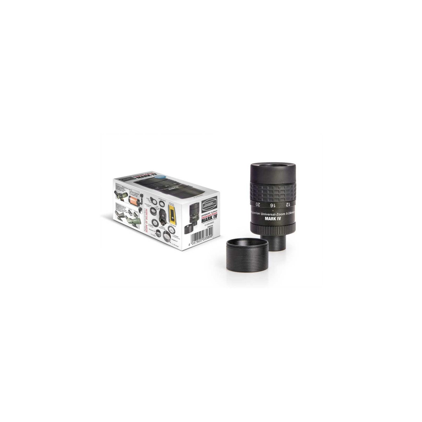 A quarta geração desta ocular pesa apenas 290 gramas (80 gramas mais leve do que a sua antecessora) - além disso, tem uma largura de 55 mm, o que a torna ideal para utilização com cabeças de binóculos.Mais importante ainda - a ocular Mark IV oferece quase mais 4 mm de retrofocagem. Este facto é benéfico para a utilização com a maioria das miras telescópicas. Muitos microscópios de observação permitem a fixação de oculares astronómicas de Ø 1¼" - mas na maioria dos casos esta combinação não permite a focagem até ao infinito. Ao utilizar o anel adaptador "A" incluído, a ocular Hyperion Zoom penetra quase 4 mm no suporte da ocular do telescópio, podendo assim focar até ao infinito. Removendo o suporte de Ø 1¼" e adicionando o anel "A", a ocular pode ser fixada de forma segura aos telescópios de observação da série Ultima Celestron. Também está disponível um adaptador de baioneta para os microscópios de observação Zeiss Diascope. A ocular também é fornecida com um anel espaçador adaptador "B" que evita que a base da ocular bata nos parafusos de montagem da ocular nos prismas zenitais. Um outro anel incluído é um anel SC de Ø 2" que permite fixar firmemente a ocular a qualquer rosca SC, nomeadamente ao prisma zenital clicklock de Ø 2", com a ajuda do anel de inversão Ø 2"/2" - M48.