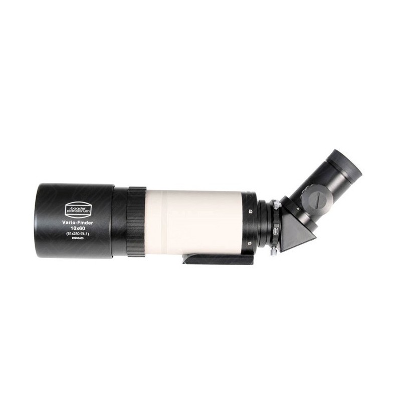 A lente Baader Vario-Finder foi concebida para trabalhar em alta ampliação. O desenho óptico é baseado na famosa lente Carl-CZeiss e é testado para fornecer um disco Airy afiado com uma ampliação de até 120x. Este pequeno telescópio de abertura de 61 mm é muito mais do que um simples localizador. Foi concebido para funcionar como um localizador óptico, como um guia, como um telescópio de localização de alta magnificação, ou mesmo como um telescópio de viagem astronómico portátil. Lente de alta qualidade de 61 mm de abertura, 250 mm de distância focal com revestimento óptico Phantom Group TM. Anel de bloqueio da lente para focagem próxima com um deslocamento de 12 mm. Botão de focagem com 35 mm de curso com quatro parafusos de segurança laterais para a utilização de câmaras de guia CCD pesadas. 1_ suporte ocular com anel de compressão e três parafusos de fixação. Prisma erector de 45° com rosca T2 e adaptador de 1/4". Ocular guia de 25 mm com retículo iluminado para medições em incrementos de 0,5 mm. Placa de rabo de pomba amovível para adaptação aos telescópios mais comuns e _ rosca para adaptação a qualquer tripé fotográfico.