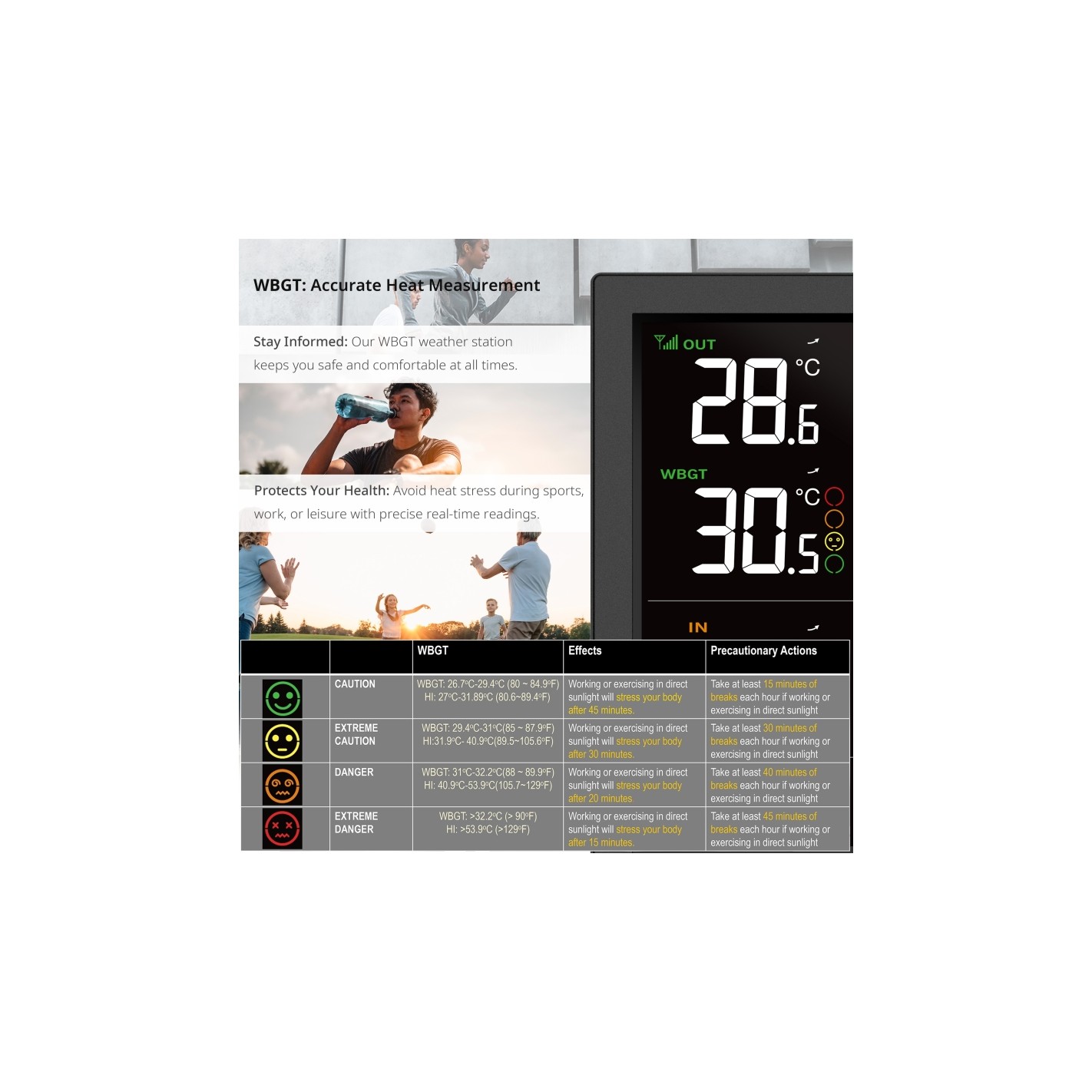 Quando o sol bate no verão, o valor WBGT (Wet Bulb Globe Temperature) com o índice de stress térmico será o seu melhor guia para actividades ao ar livre. Graças aos 4 níveis de alerta, pode identificar rapidamente o que deve ter em atenção nas condições climatéricas actuais. Perfeito para desportistas, jardineiros, etc.