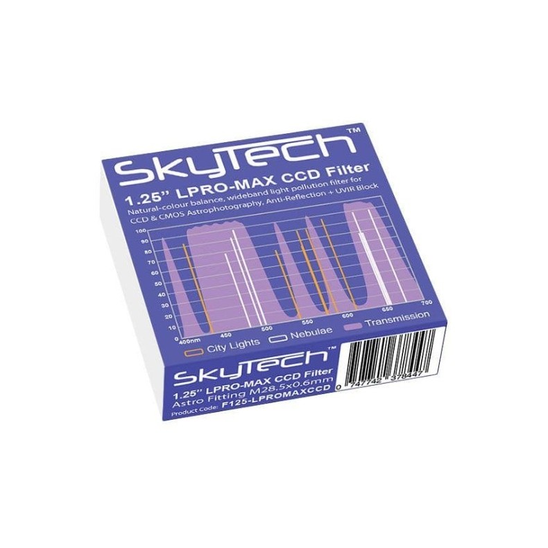 Os filtros SkyTech LPRO-MAX são adequados para câmaras CMOS e CCD a cores e monocromáticas. O LPRO-MAX bloqueia a luz ultravioleta e infravermelha para estrelas mais nítidas. As câmaras monocromáticas também podem ser utilizadas com o LPRO-MAX para captar o canal de luminância em imagens LRGB em áreas poluídas pela luz. O filtro LPRO-MAX de 1,25" é compatível com toda a gama Altair GPCAM e com as câmaras CMOS da série Hypercam 183 (o LPRO-MAX é aparafusado ao revólver frontal de 1,25" da câmara ou ao suporte de filtro magnético da Altair com deslizador opcional de 1,25"). O adaptador de lentes DSLR GPCAM / Hypercam é igualmente compatível: o filtro LPRO-MAX de 1,25" encaixa-se no compartimento atrás da lente, protegido do pó.