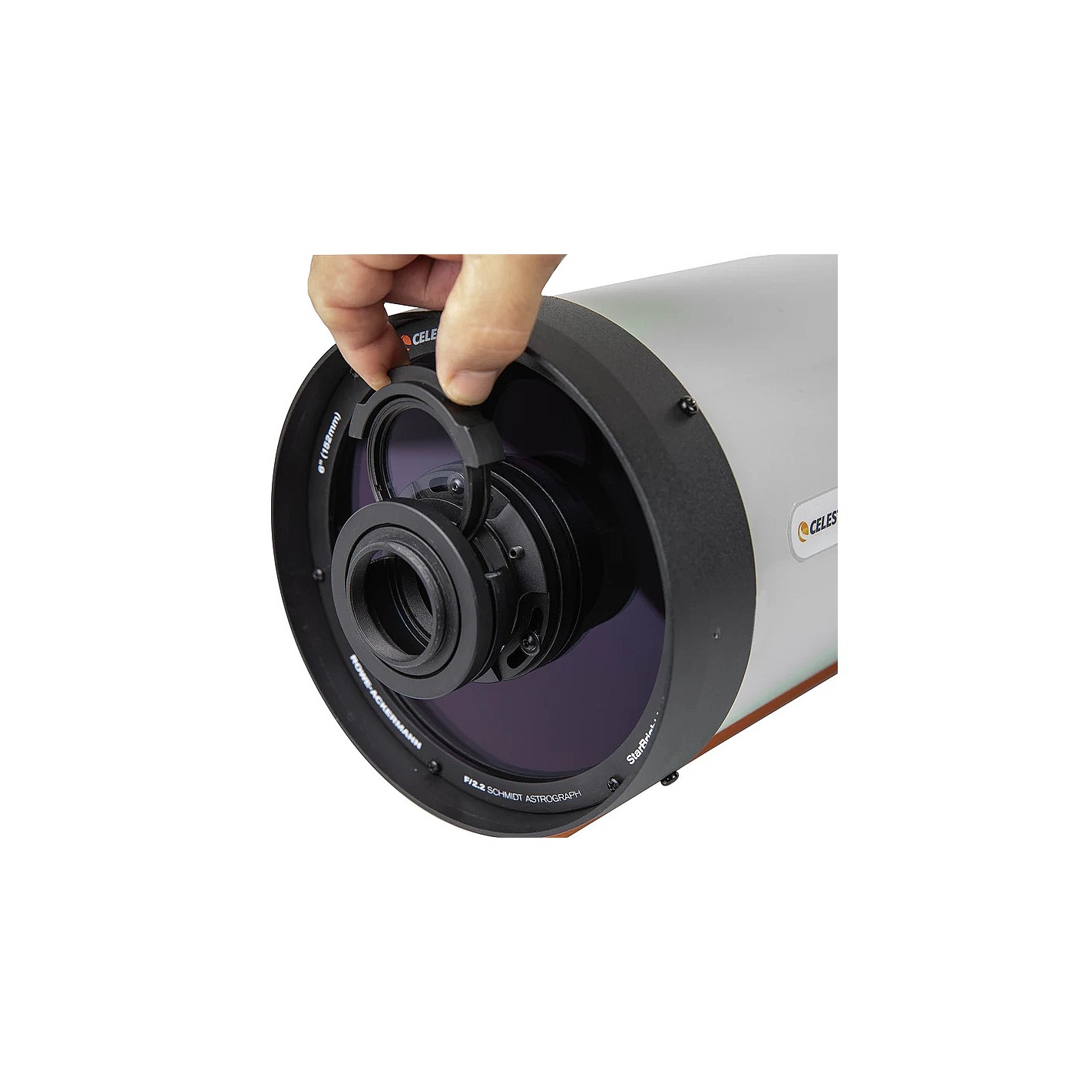 A gaveta de filtros integrada acomoda tanto filtros de 1,25" como de 2", dando-lhe a flexibilidade de utilizar vários filtros de imagem. O filtro transparente amovível de 2" (ou seja, a janela ótica) permite-lhe adicionar filtros opcionais, se desejar, sem introduzir vidro adicional no percurso ótico que possa comprometer o desempenho a f/2,2.