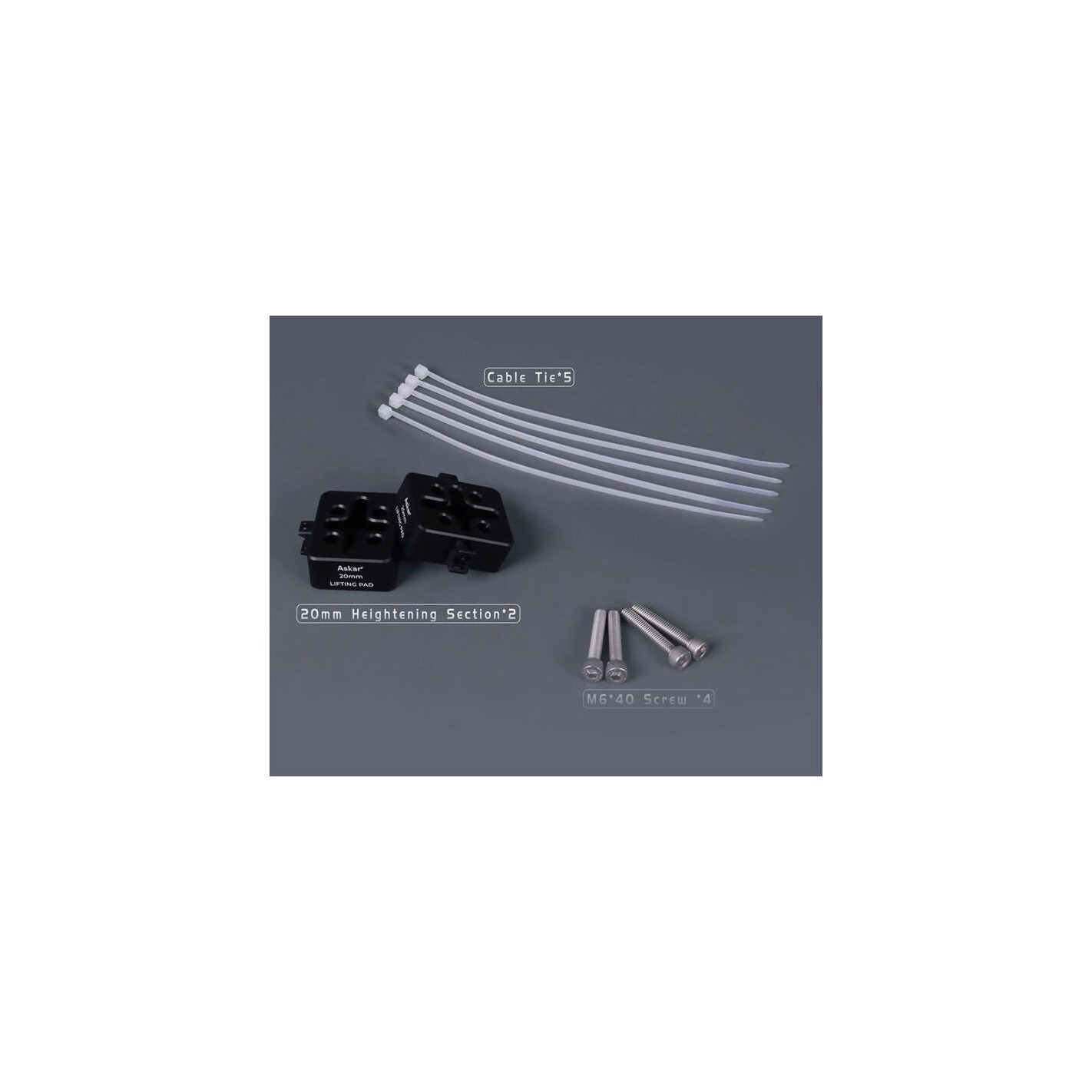 O kit inclui dois blocos de elevação de 20 mm, quatro parafusos M6 de 40 mm para instalação e cinco abraçadeiras de gestão de cabos, que podem ser fixadas em ambos os lados dos blocos para uma passagem de cabos limpa e eficiente.