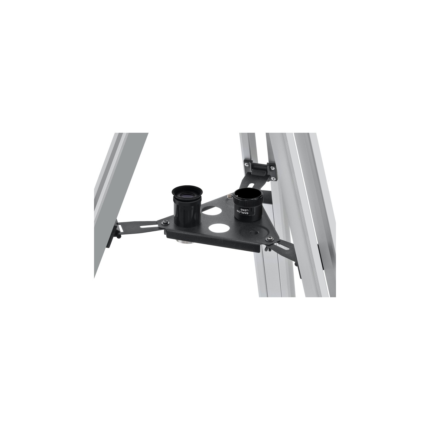 Outra vantagem desta montagem é o facto de os eixos se moverem através de dois eixos flexíveis com ajuste de precisão. Perfeito para um ajuste e alinhamento cómodo deste telescópio de nível básico. Enquanto observa descobertas fascinantes, terá sempre os seus acessórios à mão na placa de armazenamento adicional entre as pernas do tripé.