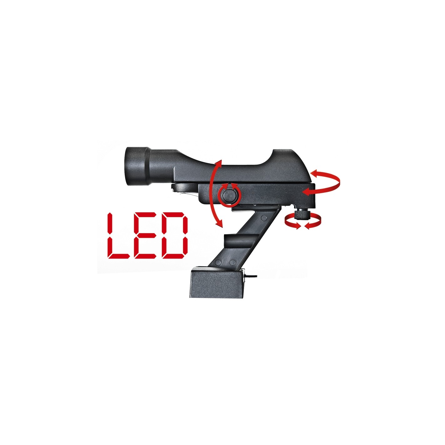 O conjunto de astronomia contém muitos acessórios com os quais pode embarcar imediatamente na sua viagem de descoberta do céu noturno. Utiliza omotor de busca LEDPara alinhar com precisão o seu telescópio de iniciação e encontrar objectos celestes mais facilmente. Basta instalar o localizador de direcções paralelas no seu telescópio. Este projecta um ponto vermelho num pequeno ecrã de vidro fosco que parece estar a flutuar em frente ao céu quando se olha através dele. Uma vez que a abertura do seu telescópio aponta exatamente na mesma direção, isto ajuda-o a seguir o céu noturno.