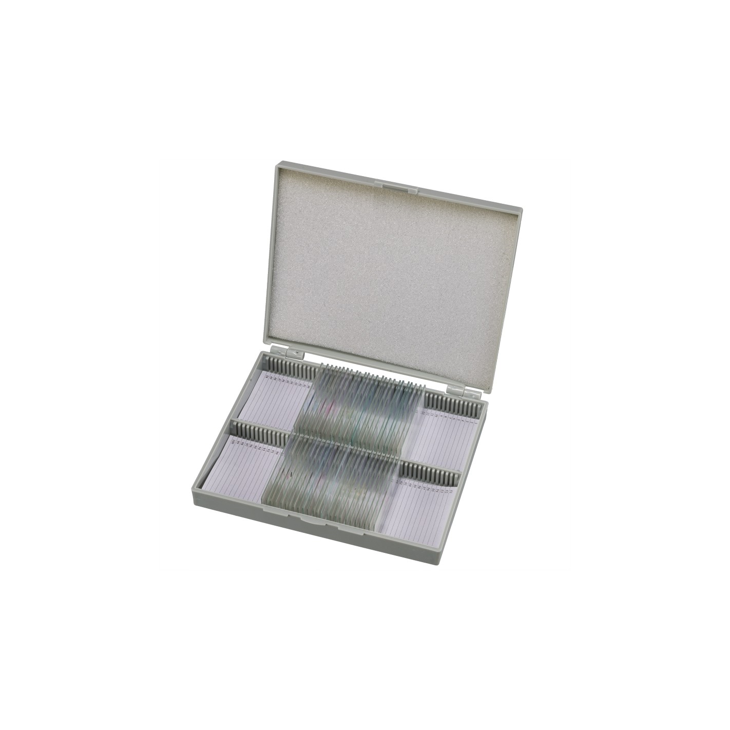 - 30 amostras de histologia preparadas numa caixa de madeira para microscopia.