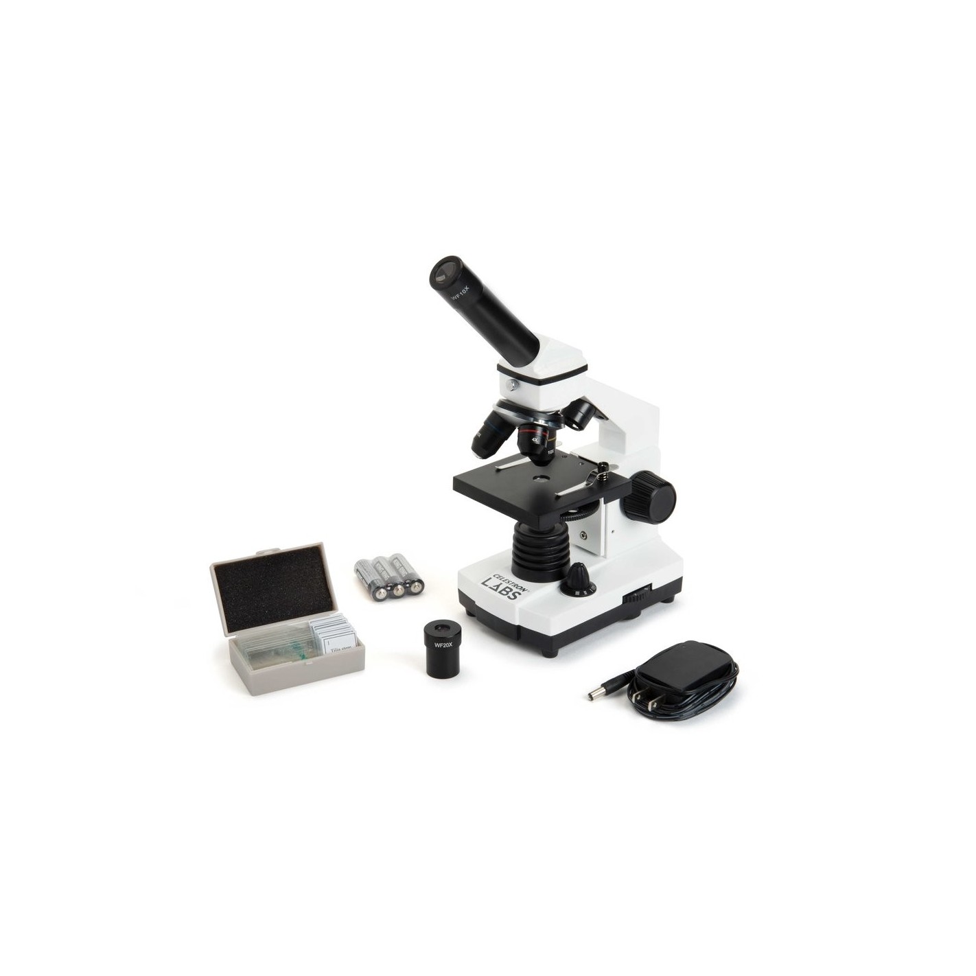 O Celestron Labs CM800 microscópio biológico apresenta os últimos avanços a um preço económico, incluindo a iluminação por LEDs incidentes e transmitidos para cores brilhantes e naturais. Duas oculares (10x e 20x) e três objectivos acromáticos (4x, 10x e 40x) proporcionam uma gama de ampliação de 40x a 800x.