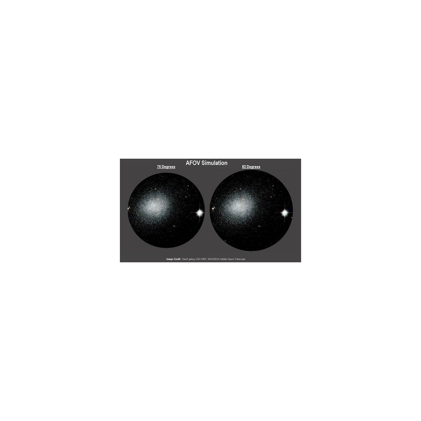 - Alta definição em todo o campo: o campo de visão de 76° é insuperável por qualquer outra ocular moderna de campo largo. A nitidez do eixo visual e o contraste oferecidos por estas oculares rivalizam com as nossas melhores oculares planetárias, oferecendo ao mesmo tempo um desempenho quase equivalente em todo o campo. As estrelas aparecem absolutamente pontiagudas ao afastar-se do centro, e o campo permanece completamente plano, mesmo em telescópios de curta distância focal.