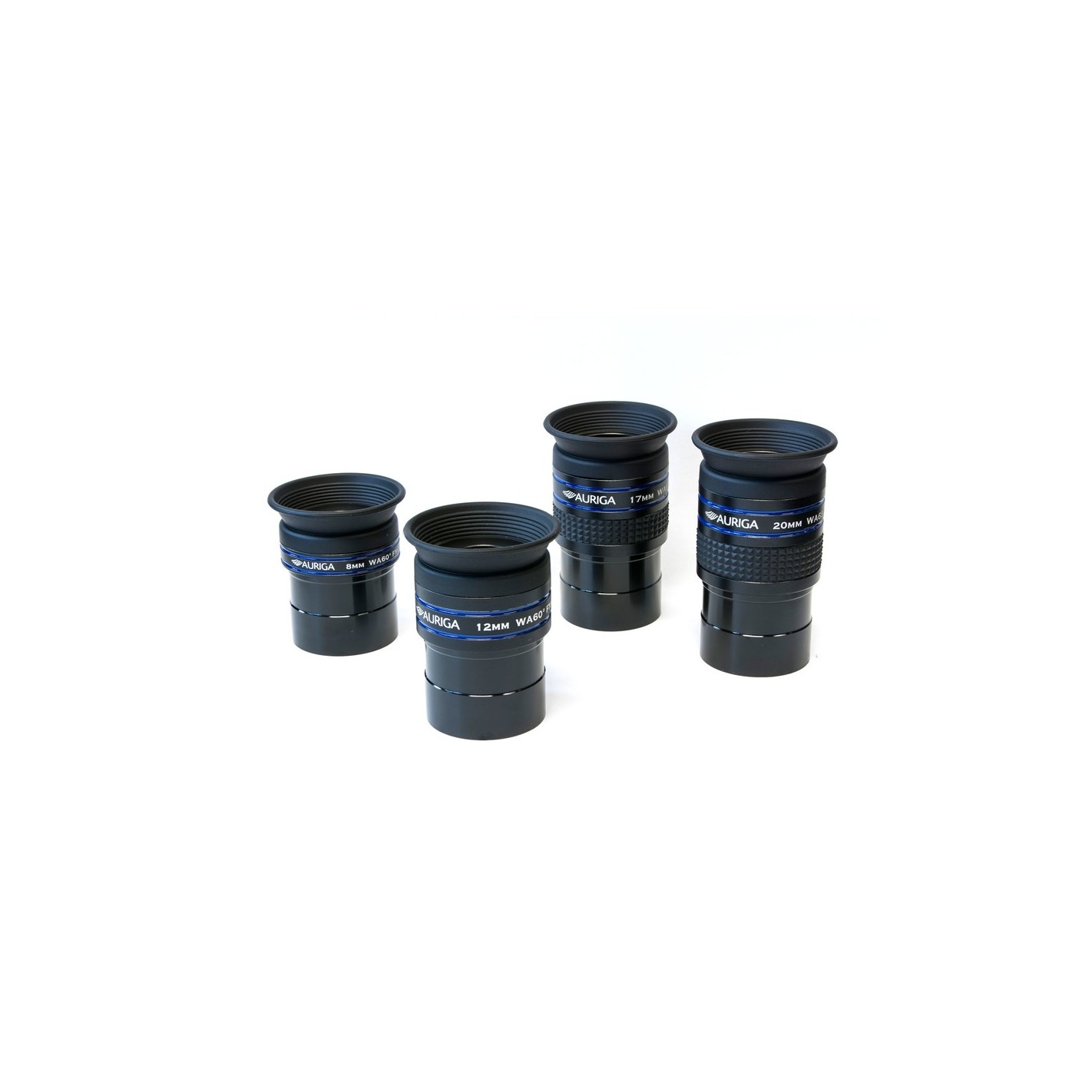 Auriga apresenta a família de oculares com um campo aparente de 65° de ângulo largo (para o modelo de 8 mm, o campo é de 60°), barril de 31,8 mm e revestimento anti-reflexo FMC. A série Auriga WA consiste em quatro oculares de 8 mm, 12 mm, 17 mm e 20 mm respectivamente. As oculares da série WA Auriga são compostas por 4 elementos. O desenho óptico destas oculares garante uma experiência excepcional do utilizador em todos os tipos de instrumentos. O campo aparente de 65° (para o modelo de 8 mm, o campo é de 60°) representa o compromisso ideal para quem procura oculares com uma elevada relação preço-desempenho e como uma actualização para os acessórios padrão normalmente incluídos nos instrumentos astronómicos de nível básico e médio. A nitidez e o contraste destas oculares surpreenderão até os observadores mais cuidadosos e escrupulosos. Incríveis observações da superfície lunar, do Sol, planetas e até objectos do céu profundo esperam por si. Todas as oculares da série são caracterizadas por um relevo ocular de 17 mm. O desempenho nos bordos do campo é bom e não são visíveis quaisquer reflexos ou artefactos espúrios. O revestimento anti-reflexo FMC assegura níveis muito elevados de modulação de contraste com imagens claras, brilhantes, bem definidas e sem artefactos.