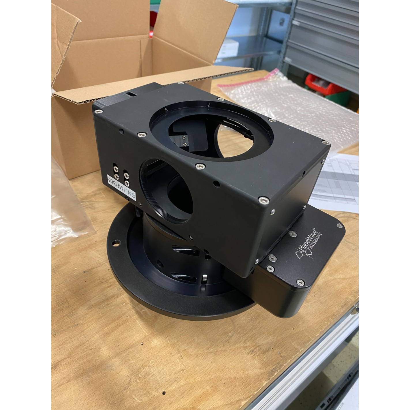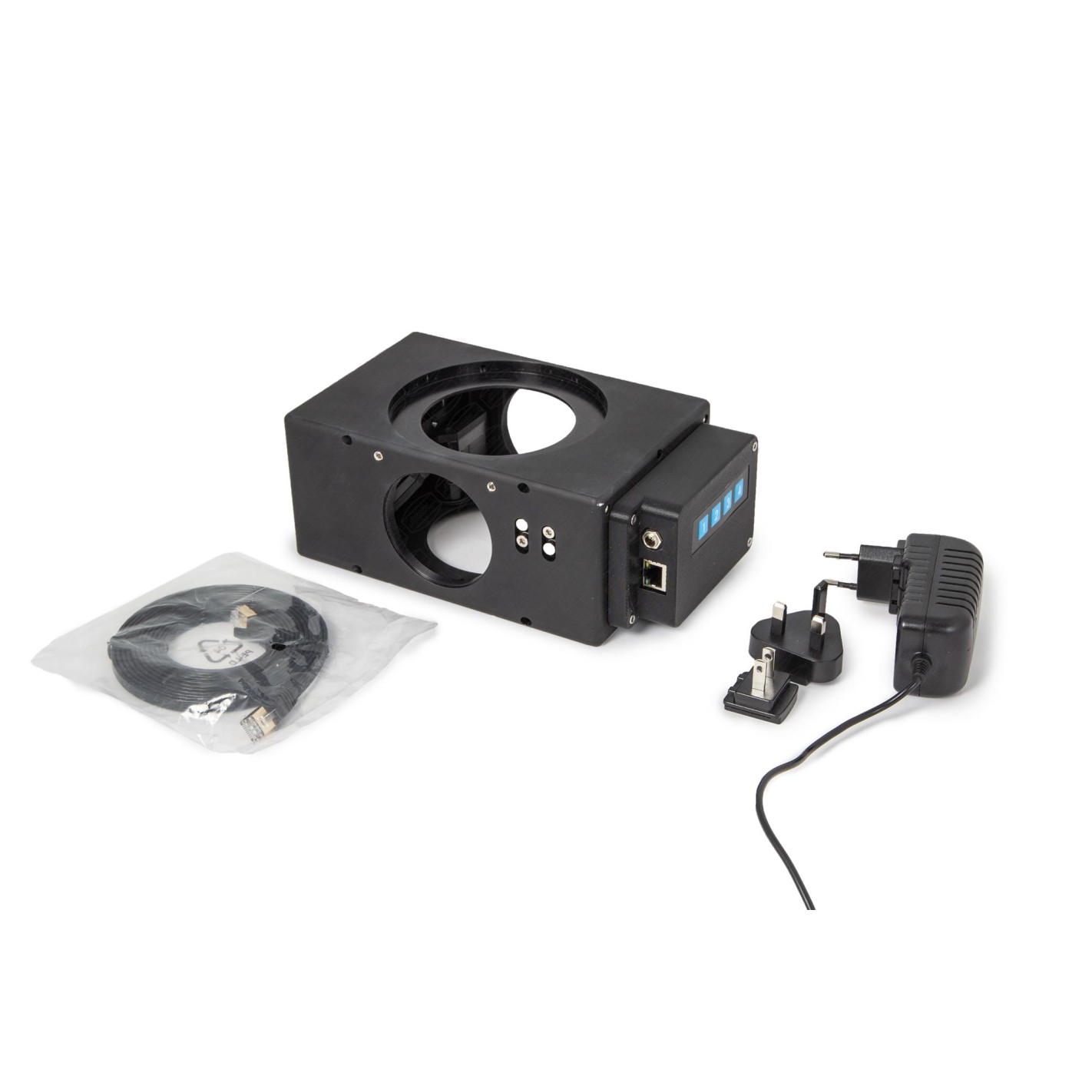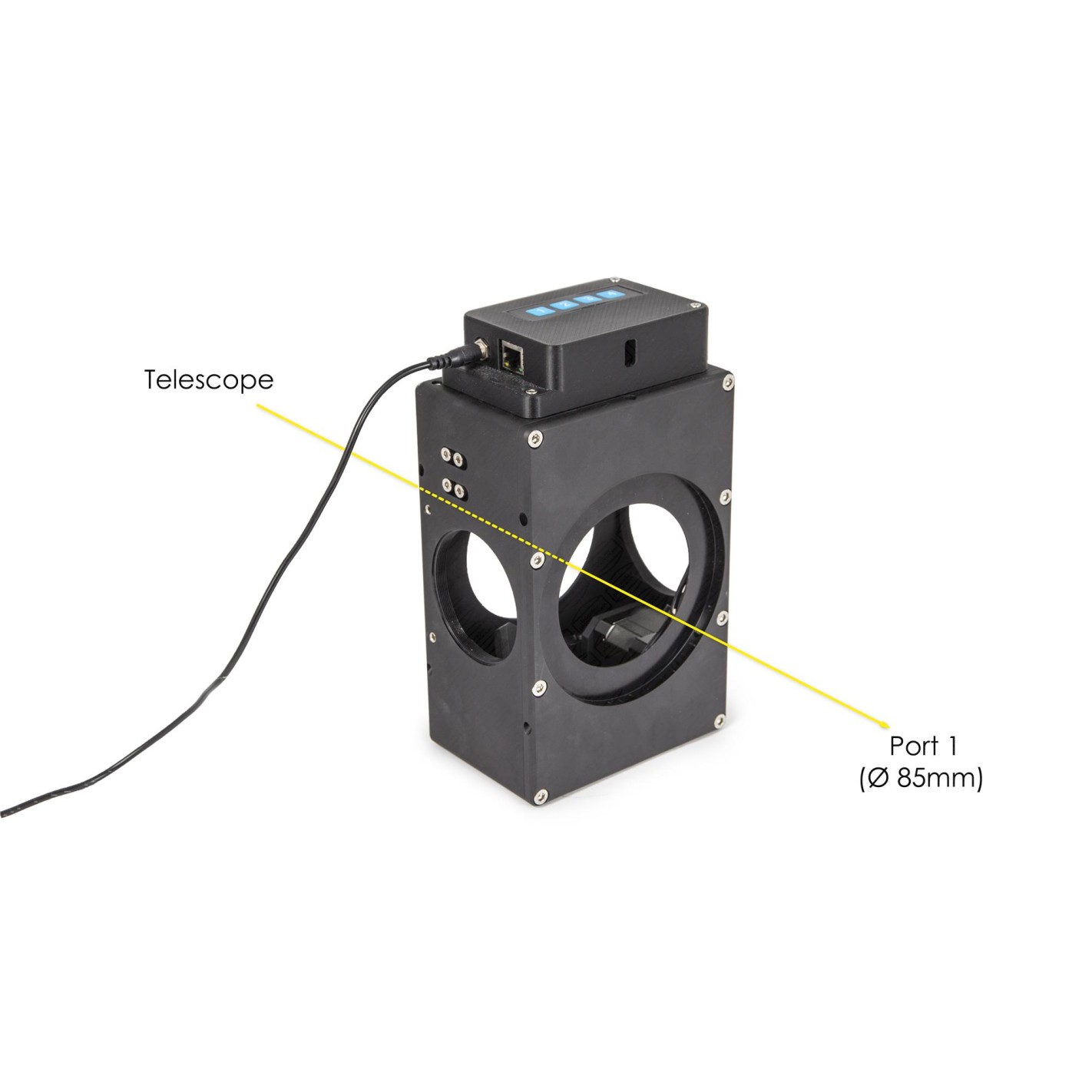 Este dispositivo é uma derivação direta dos nossos desenvolvimentos de observatório remoto. A caixa maciça em duralumínio maquinada por CNC suporta mesmo as cargas mais pesadas de câmaras de grande dimensão. A capacidade de obter múltiplos benefícios de um telescópio abre mundos completamente novos para observatórios remotos, bem como para astrónomos amadores ou observatórios regulares. Um observatório remoto nunca mais terá de ser reconfigurado: uma unidade pode agora ser equipada com uma câmara astronómica de céu profundo, uma câmara planetária e um espetrógrafo sem ter de solicitar tempo de conversão ao pessoal. Um observatório com espectáculos públicos pode finalmente deixar a câmara permanentemente no telescópio principal e continuar a utilizá-la para observações de convidados sem qualquer problema. Após as visitas guiadas, não há necessidade de perder tempo a limpar e a reconstruir o equipamento: o telescópio pode ser imediatamente utilizado para astrofotografia com um simples toque num botão. As possibilidades deste sistema são tão diversas como os domínios da astronomia.