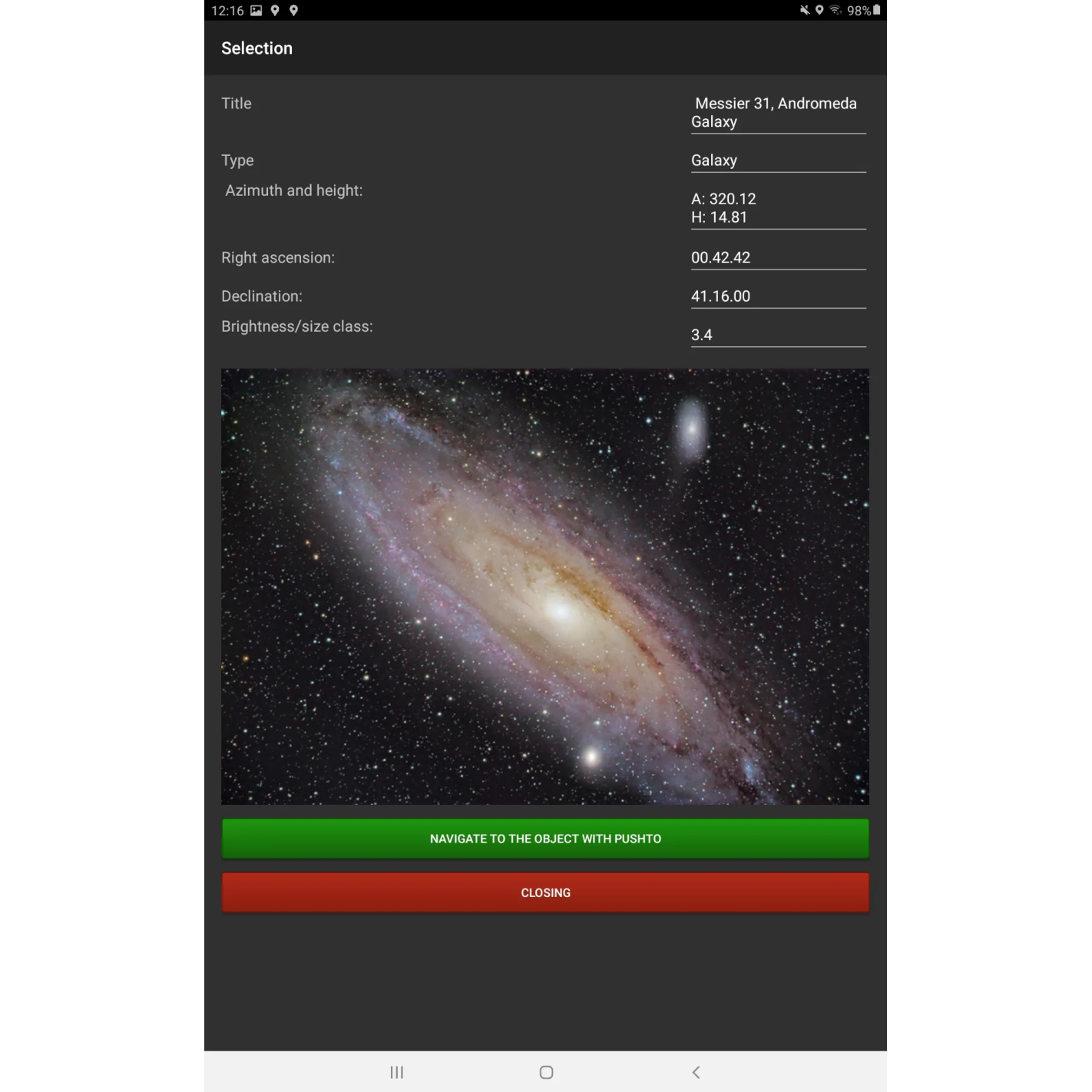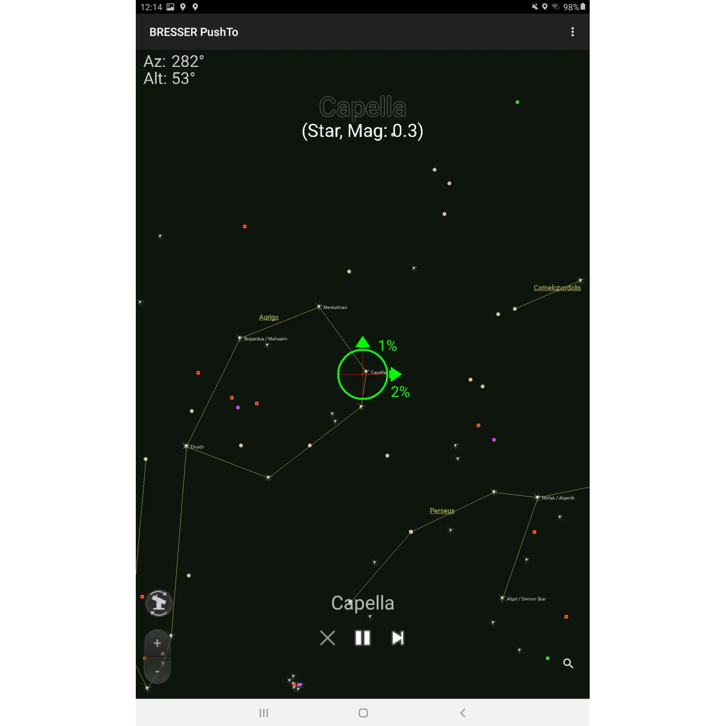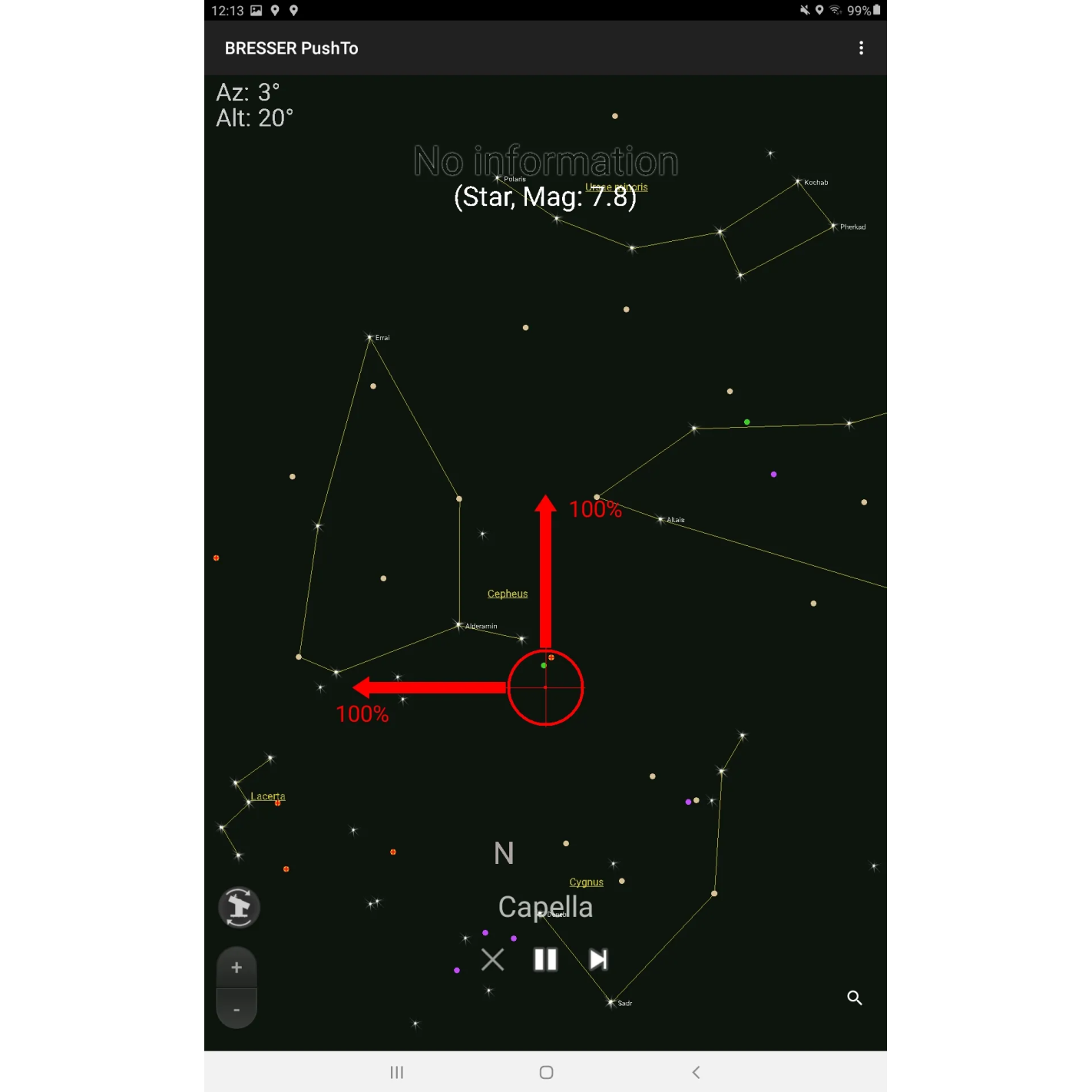 Depois de configurar o telescópio, a exploração do céu pode começar de imediato: Basta escolher tocando em qualquer objeto celeste no mapa estelar na aplicação PushTo Navigations. A partir de agora, verá setas de direção na aplicação que mudam de comprimento e cor à medida que se aproxima do objeto, guiando-o em segurança até ao seu alvo. O movimento do telescópio é transmitido quase em tempo real no mapa estelar. E quando chegar ao seu destino, pode admirar o objeto celeste selecionado.