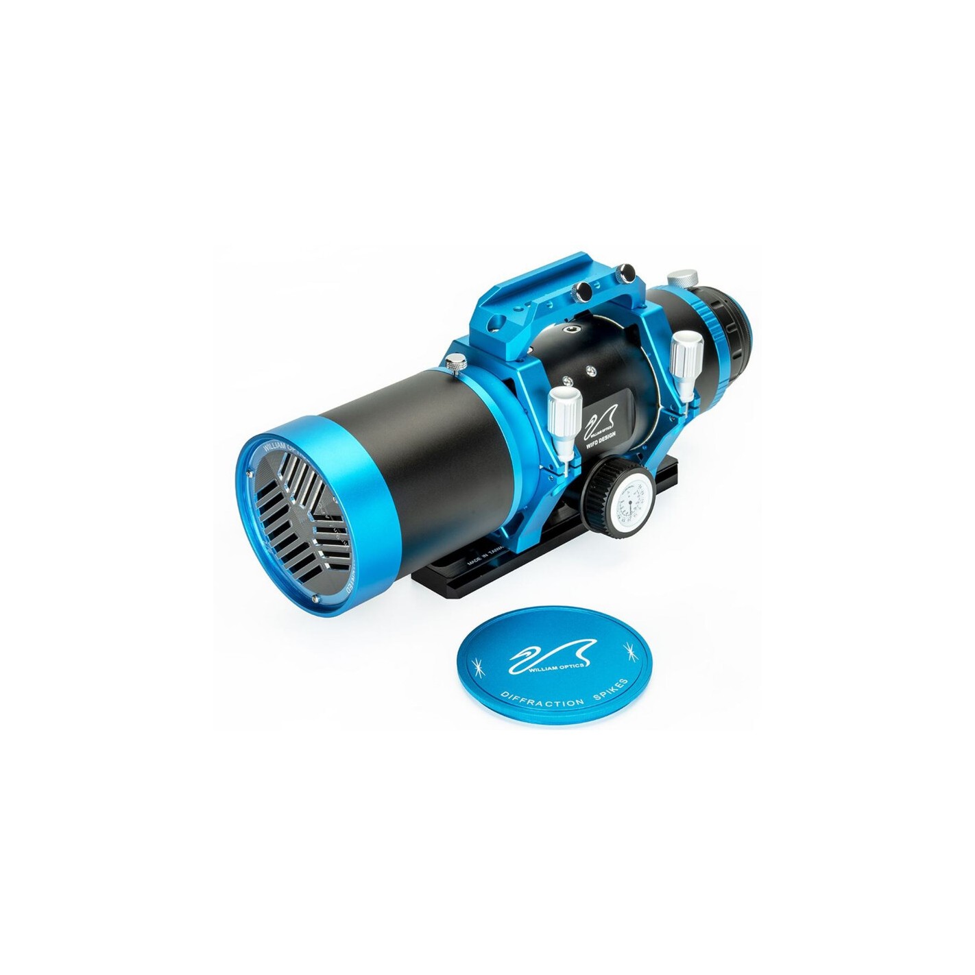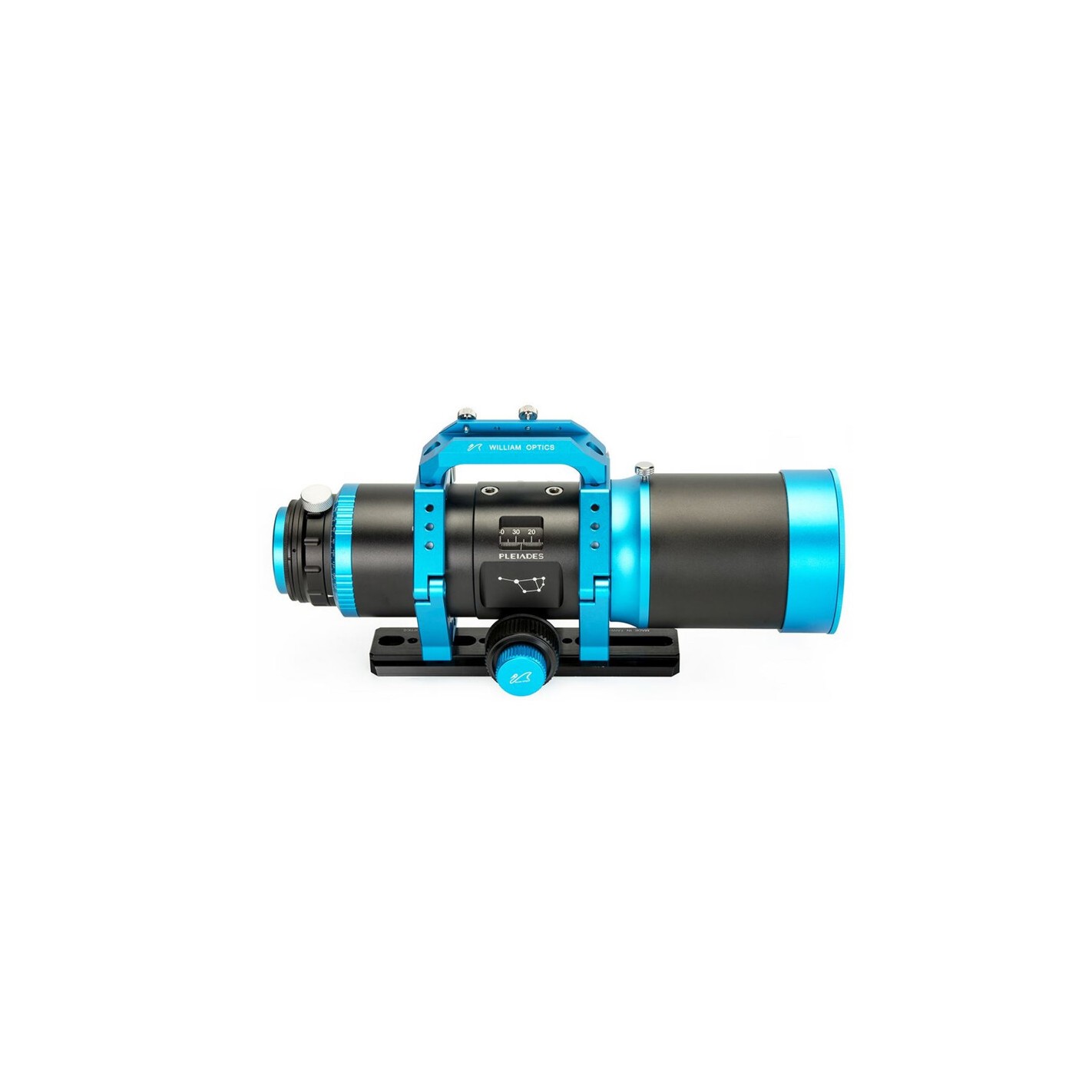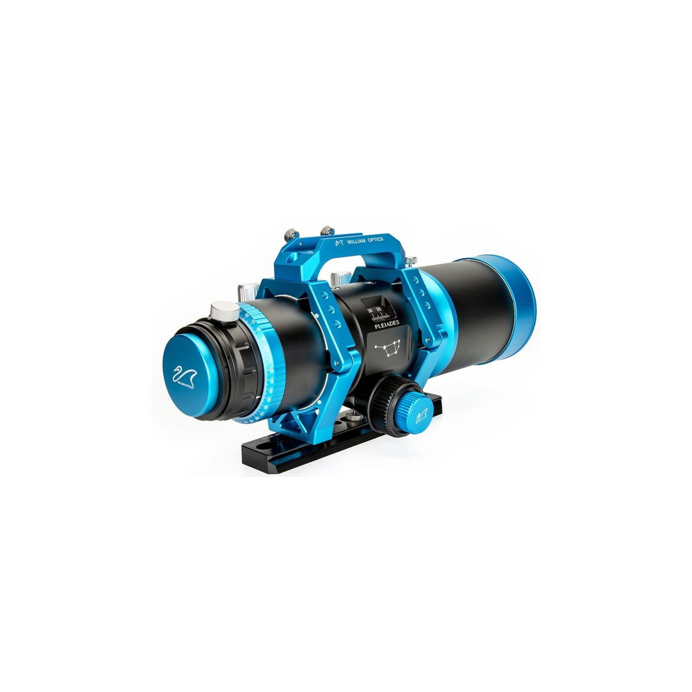 O design do Pleiades 111 é inspirado no aglomerado de estrelas que lhe dá o nome e distingue-se pela sua elegante cor preta e azul. Inclui um guia de prisma Vixen/GP, bem como uma pega prática que também acomoda localizadores ou tubos guia da William Optics.